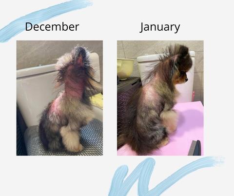 You can see the shift from November thru January. By slowing the treatment, we don't stress the dog's skin. Sensitivity is common in dogs going through treatment and it's fine to decrease use for a few days.