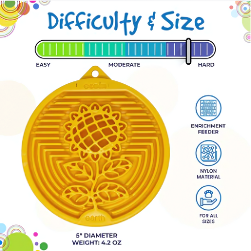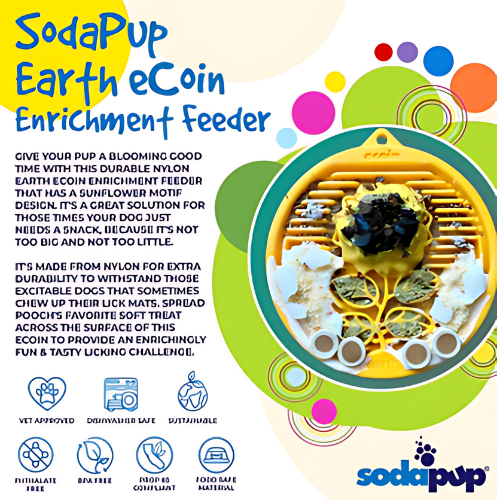 ENRICHMENT: This ultra-durable nylon eCoin with a sunflower motif is designed for enrichment snacks and built to withstand those excitable dogs that sometimes chew up their lick mats. This toy helps keep your dog entertained and solves problem chewing behaviors. Smear soft foods into the surface and let your dog lick away!